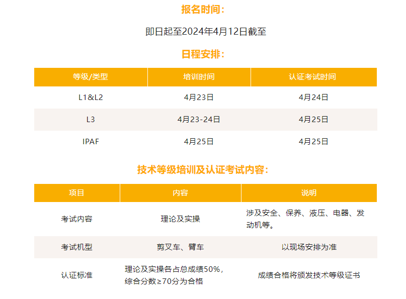 各位朋友們:2024年度歐歷勝培訓活動開始啦!本次培訓活動設高機技術培訓&IPAF安全操作培訓即日起報名開啟,快來報名參與吧!考試內(nèi)容培訓地點:歐歷勝常州工廠(江蘇省常州市新北區(qū)龍城大道260···
